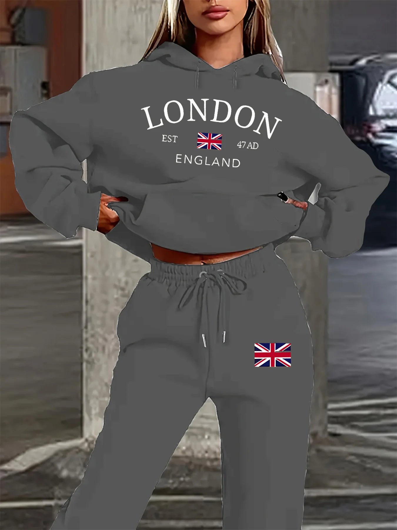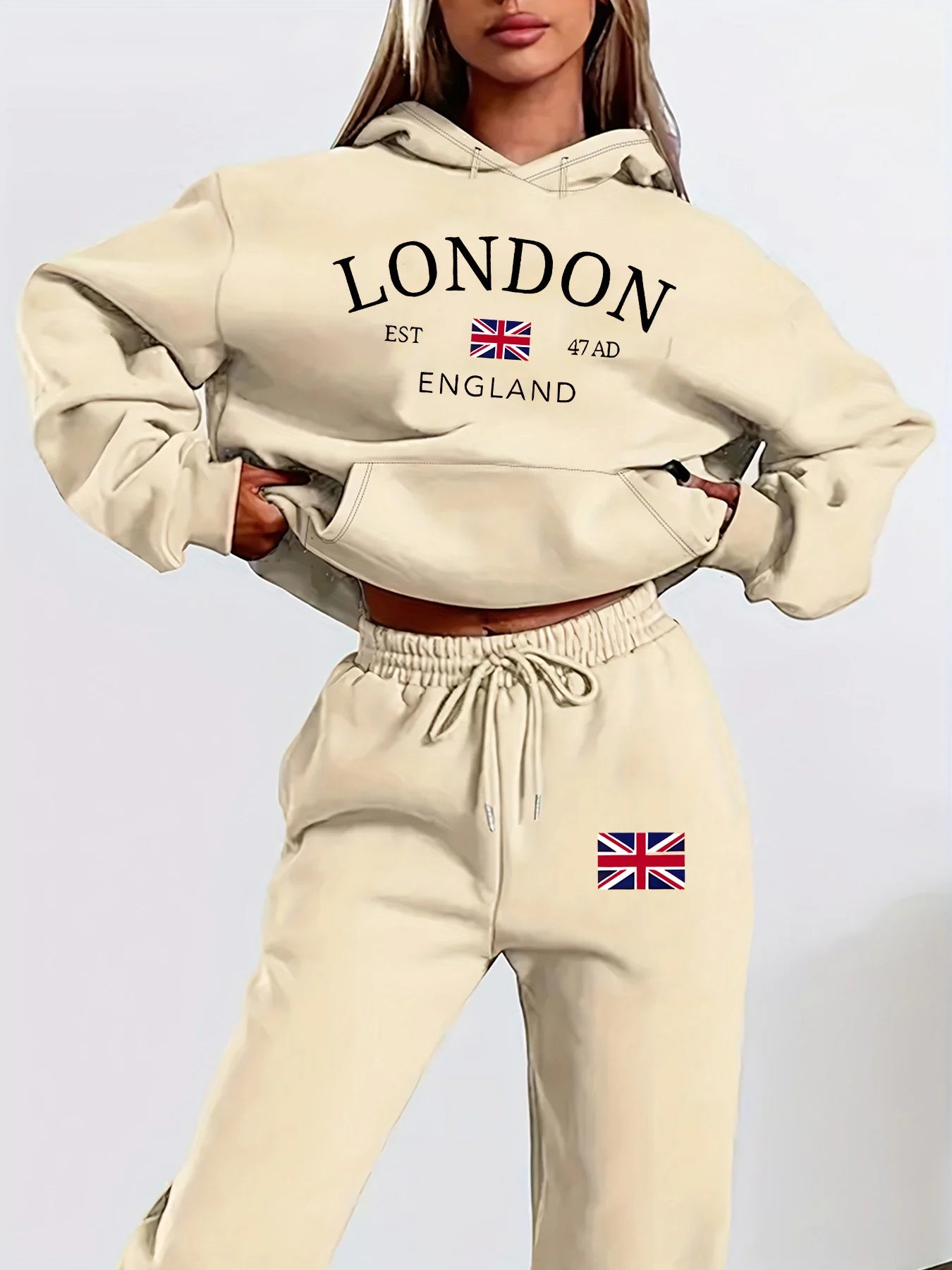 Women's autumn and winter fashion casual London England pattern print with thick fleece warm hooded sweatshirt+sports pants set